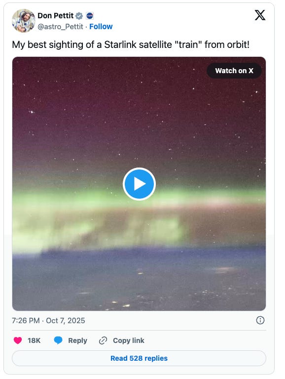 El astronauta Don Pettit, que regresó a la Tierra en abril tras seis meses en la Estación Espacial Internacional, compartió un video de lo que describió como su mejor avistamiento de un “tren” de satélites Starlink desde la órbita: una docena de ellos alineados sobre la Tierra, con auroras de fondo y los paneles solares brillando al reflejar la luz del sol.